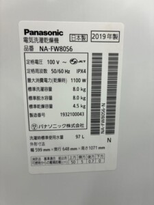 大阪府松原市南新町へ出張買取 Panasonic NA-FW80S6-W 2019年製 使用感あり・内部清潔のためスムーズ査定となりました。
