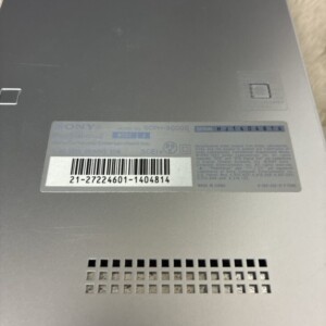 外装トップ面を中心に擦り傷が多数見受けられ、細かな打痕も一部に確認できました。上蓋の開閉は良好で、ディスクトレイ内は使用感はあるものの破損なし。写真のとおり本体のみで、コントローラー・電源コード・AVケーブル・メモリーカードは欠品です。底面ラベルから型番はSCPH-90000(NTSC J)を確認でき、シルバー筐体の最終世代スリムモデルに該当します。