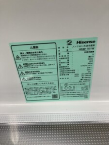 京都府亀岡市篠町馬堀から出張買取 Hisense ノンフロン冷凍冷蔵庫 HR-D1701W 2024年製 を高価査定しました