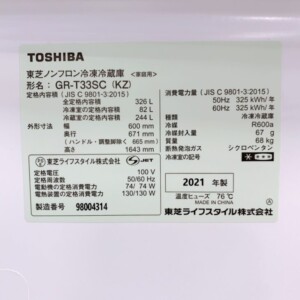 今回は山梨県富士吉田市にお住まいの30代ご夫婦より、東芝 ノンフロン冷凍冷蔵庫 GR-T33SC(KZ)(326L・2021年製)を出張買取にてご依頼いただきました。