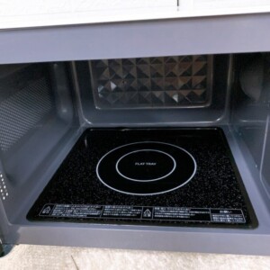 庫内はフラットトレー仕様で、焦げ付きや大きな汚れもなく比較的きれいな状態でした。外観は白を基調としたデザインで、天面と側面に多少の使用感はあるものの、動作確認では温め機能や解凍機能に不具合は見られませんでした。ダイヤル式の操作パネルも正常に機能し、家庭用として十分使用可能な状態です。
