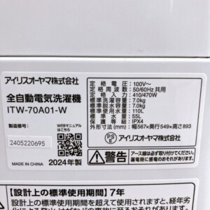 今回は福岡県北九州市にお住まいの30代男性のお客様よりアイリスオーヤマ製の全自動電気洗濯機 ITW-70A01-W(2024年製)を出張買取のご依頼いただきました。