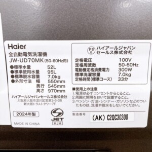 今回は香川県善通寺市にお住まいの40代男性のお客様よりハイアール製 全自動電気洗濯機 JW-UD70MK(2024年製)を出張買取のご依頼いただきました。