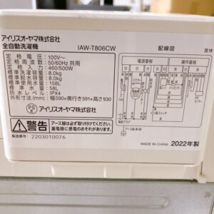 今回は広島県尾道市にお住まいの30代男性より、アイリスオーヤマ製の全自動洗濯機 IAW-T806CW(2022年製・8.0kg)を出張買取にてご依頼いただきました。