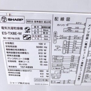 シャープ ES-TX8E-Wは8.0kgの洗濯容量と乾燥機能を備えた人気モデルであり2020年製モデルであることから市場価値も高い状態でした。全体的に使用感ありますが良好な動作を確認できたため査定価格は8000円をご提示いたしました。