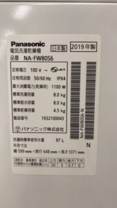 大阪府大阪市にてPanasonic洗濯乾燥機 NA-FW80S6(2019年製・良好状態)を出張買取しました