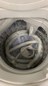 お預かりしたES-GE5F-Wは、外装にやや擦り傷が見受けられるものの、庫内は清潔でカビや臭いもなく良好な状態でした。動作確認も問題なく、付属品として排水ホース・給水ホースが揃っているため、再販に適したコンディションと判断いたしました。