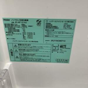 Haierの冷蔵庫JR-NF121NJは2022年製モデルで大きな目立った傷や傷は少なかったため、お買取りのご提示ができました。中古市場でも需要が高い容量121Lタイプの冷蔵庫という点を踏まえ最終的に3000円での買取といたしました。