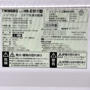 今回は東京都墨田区にお住まいの30代女性より、ツインバード 2ドア冷凍冷蔵庫 HR-E911(2020年製)を出張買取にてご依頼いただきました。