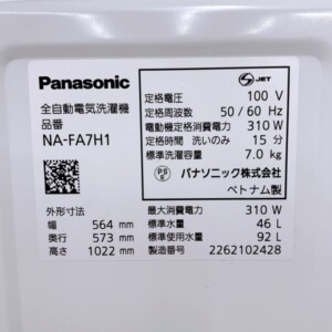 今回は大阪府羽曳野市にお住まいの30代女性・主婦より、Panasonic 全自動洗濯機 NA-FA7H1(2022年製・7.0kg)を出張買取にてご依頼いただきました。