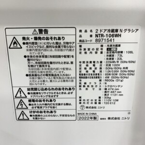 今回は綾瀬市にお住まいの30代男性の方よりニトリ 2ドア冷蔵庫 Nグラシア NTR-106WH(2022年製)を出張買取にてご依頼いただきました。