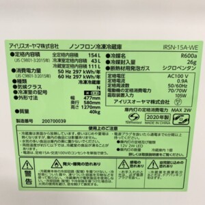 千葉県千葉市でアイリスオーヤマ 冷凍冷蔵庫 IRSN-15A-WE 出張買取 2020年製 良好な状態で査定しました