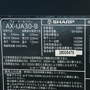 お買取りしたウォーターオーブンAX-UA30-Bは外観に細かな擦り傷や使用感が見受けられる状態でしたが加熱やオーブン機能は正常に動作し庫内の汚れも比較的少ない状態でした。付属品である電源コードも問題なく使用可能で動作確認の結果も良好でした。日常的に使われていた痕跡はあるものの機能性に影響する大きなダメージはありませんでした。