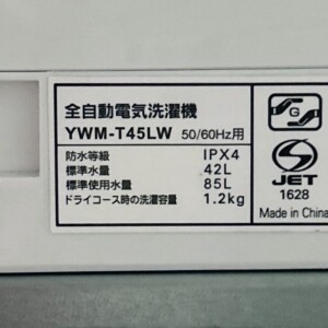 お買取りした洗濯機YWM-T45LWは外装にわずかな擦れ傷が見受けられるものの洗濯槽内部はきれいで動作も正常に確認できました。標準水量42L、洗濯容量4.5kgとコンパクト設計で単身者や少人数世帯に適したモデルです。排水ホースや操作パネルも不具合はなく全体的に良好な状態でした。