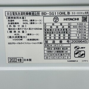 千葉県船橋市で日立ドラム式洗濯乾燥機 BD-SG110HLを出張買取 2022年製で状態良好なため高額査定となりました