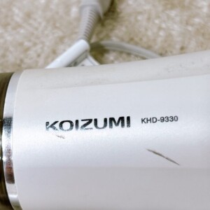 お買取となったヘアードライヤーKOIZUMI KHD-9330は全体的に使用感があり外装には細かな傷や若干の変色が見られました。動作については問題なく使用可能でコード部分も断線や大きな破損は確認されませんでした。付属品はなく本体のみの査定となりました。