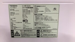 今回は島根県浜田市にお住まいの30代女性よりTWINBIRD(ツインバード)の2ドア冷凍冷蔵庫 HR-EJ23(2024年製)を出張買取にてご依頼いただきました。