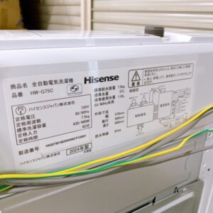 今回は静岡県伊東市にお住まいの20代男性のお客様より、Hisense 全自動電気洗濯機 HW-G75C(2024年製・7.5kg)を出張買取にてご依頼いただきました。