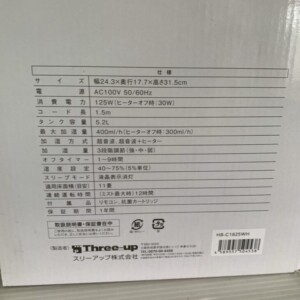 Three-up HB-C1825WHは2018年製モデルでタンク容量5.2Lで最大加湿量400ml/hを誇る機能性の高いモデルです。使用感は多少見られるものの、人気の「NEWスクエアミスト」シリーズで市場での需要もありました。しかし製造年数が古い為、単体でのお買取りが難しく、追加でお出し頂けた商品とおまとめで引取させて頂く事で加湿器は無料での引取のをご案内となりました。