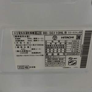 大阪府羽曳野市で日立 ドラム式洗濯乾燥機 BD-SG110HL(2022年製)を出張買取|使用感少なめで高価査定