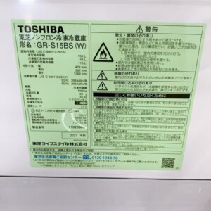 今回は埼玉県越谷市にお住まいの30代男性のお客様より東芝ノンフロン冷凍冷蔵庫 GR-S15BS(2021年製)の出張買取をご依頼いただきました。