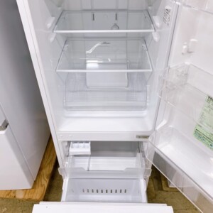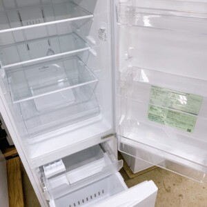 お買取した冷蔵庫は容量153L、冷凍室43L/冷蔵室110Lのコンパクトモデルです。外装・庫内ともに大きなキズや汚れもなく綺麗な状態でした。棚板やトレー、ドアポケットも揃っており使用感も少なく良好なコンディションでした。