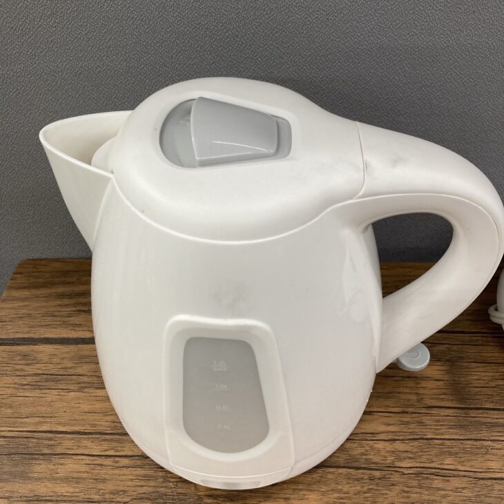 お預かりした電気ケトルは、外装に若干の使用感や擦れが見受けられる状態でした。内部は水垢の付着がありましたが、動作は問題なく正常に沸騰する状態であることを確認しました。箱や説明書など付属品はありませんでしたが、容量1.2Lの一般的な家庭用ケトルとして実用性は十分に残っていました。