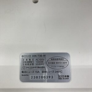 お預かりしたIHコンロは、外装に軽微な汚れや擦れがあるものの、動作は問題なく正常に使用可能な状態でした。加熱ボタンや温度調整機能も全て動作確認済みで、焦げ付きや大きな傷はありませんでした。付属品として取扱説明書や外箱はございませんでしたが、比較的新しい2023年製のため市場需要も高い製品です。