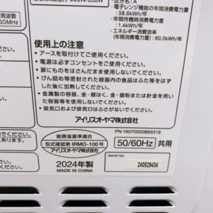 今回は兵庫県宝塚市にお住まいの50代夫婦より、アイリスオーヤマ(IRIS OHYAMA)電子レンジ IMMO-100(2024年製)の出張買取をご依頼いただきました。