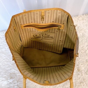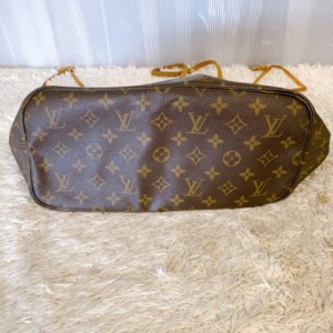 お買取りしたネヴァーフルMMは、角スレや底面の型崩れと汚れ、持ち手にも若干の使用感が見られる状態でした。さらに内側にシミやヨゴレが確認されましたが、外観のモノグラムキャンバス部分には大きなキズや破損はなく全体としてまだ十分に使用可能な良好コンディションでした。