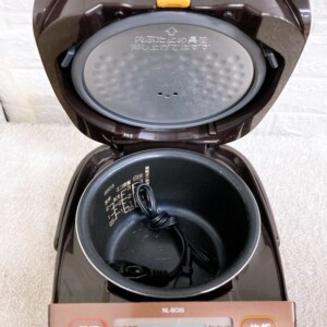 お引き取りしたNL-BC05は、動作良好で主要機能に問題はありませんでした。外装に細かなスレや使用に伴うツヤ落ちが見られましたが、内釜の状態は比較的良好で、通電・加熱・保温機能も正常に作動。コードや内ぶたなど付属部品も揃っていました。