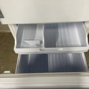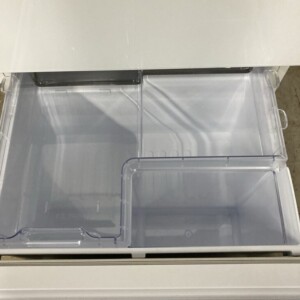 外装カラーは清潔感のあるホワイト。正面パネル・側面にご使用に伴う薄い擦れが見られる程度で、目立つへこみはありません。庫内は棚板・ドアポケット・ケースが揃い、氷・水漏れ跡などのダメージも少なく状態は良好。中段フリーザーは二段トレー+深型ケースで開閉スムーズ、下段の野菜室はクリアケースが割れなく残っていました。動作は冷却・灯火ともに正常で、異音も確認されませんでした。
