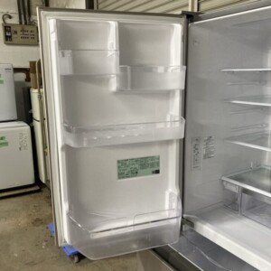 外装カラーはヘアライン調シルバーで、キッチンに馴染む落ち着いたデザイン。前面パネルと中段引き出し周辺にご使用由来のうすい擦れが数か所見受けられましたが、目立つへこみはありません。庫内は棚板・ケース・ドアポケットが欠品なく揃い、パッキンの密着性も良好。動作は冷却・冷凍・庫内灯とも正常で異音や水漏れはありませんでした。