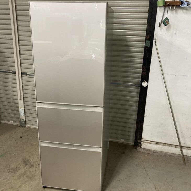 前面は上品なガラス調のベージュ系パネル。正面と中段引き出しの周辺にご使用に伴ううすい擦れが見られましたが、大きなへこみはありません。庫内は棚板・ドアポケット・チルドケース・冷凍室トレー・野菜ケースがそろっており、割れ欠けはなし。通電確認では冷蔵・冷凍の温度保持、庫内灯、ファン音とも良好で、異音・水漏れは認められませんでした。