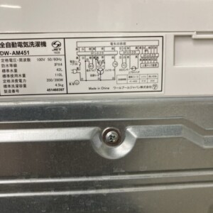 お預かりしたDW-AM451は、使用期間の短い非常にきれいな状態でした。外装に目立った傷や変色はなく、洗濯槽内部も清潔に保たれていました。排水ホースや給水ホースも付属し、動作確認でも問題なし。ほぼ新品に近い状態での買取となりました。