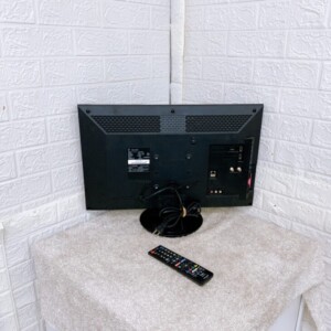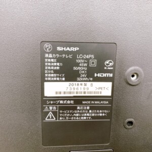 本体の動作は映像・音声ともに良好で、地デジ受信・外部入力の切替・音量操作に問題はありませんでした。外観はベゼルと台座に日常使用に伴う細かな擦り傷が見られる状態。背面ラベルより型番LC-24P5、定格消費電力45W、年間消費電力量32kWh、受信機型サイズ24V、区分名DK1を確認。純正リモコン(GB225SA)と電源コードが揃っており、ボタンの反応も良好でした。画面ムラやドット欠け、端子の緩みはありません。