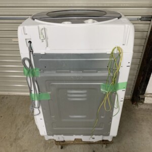 外装は正面・側面ともに生活使用に伴う薄い擦り傷が数か所ありますが、凹みや割れはありません。天面パネルの表示・ボタン印字は鮮明で、蓋の開閉やフタロックの反応も良好。槽内は臭い残りが少なく、糸くずフィルターの破れなし。背面の配線・固定部に劣化は見られず、給水ホース・排水ホース・電源コードが揃っていました(取扱説明書は欠品)。簡易動作では電源投入、通常洗い、脱水、風乾燥まで確認でき、インバーター制御らしい静かな運転音が保たれていました。