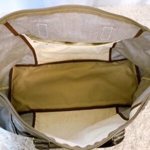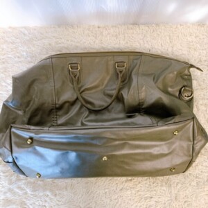素材は光沢のあるPVCコーティング×合皮で、カラーはオリーブ系。底鋲付きで自立しやすい仕様です。外観には使用に伴うシワ・ヨレ・軽い型崩れ、角周りに擦れ、金具にくすみが見られました。ファスナーの可動は良好。内装は生成りの布地で、写真の通り点在するシミ・薄汚れを確認しています。さらに片側にDカンがあるもののショルダーストラップは欠品。破れなどの致命的ダメージはなく、実用は可能という評価です。