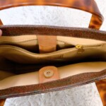 定番のペイズリーPVCにベージュ系レザー内装、丸みのあるべっ甲調の樹脂ハンドルが特徴のモデルです。外観は使用に伴う角スレやパネルのわずかな型崩れ、表面の細かな圧痕が見られましたが、柄の発色は良好。開口部はマグネットホックで、内側にはファスナーポケットを装備。内装レザー/布地は擦れの少ない清潔な状態で、ベタつきや破れは確認されませんでした。金具は小キズ程度、ハンドルは艶が保たれぐらつきなし。付属品(保存袋・箱)はありませんが、総合して実用性の高いコンディションです。