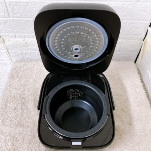 天面パネルにはボタン表示が明瞭で、予約・エコ炊飯・早炊き・保温・冷凍用早炊き・おかゆ・玄米などのメニューが確認できました。外装は光沢ブラックで、上面に拭き取りで薄く残るスレ・点状の小キズが見られます。内ぶたは使用に伴う水滴跡があるものの、破損はありません。内釜のコーティングははがれや大きなキズがなく良好で、目盛りもくっきり。通電・ボタン反応・加熱の立ち上がりは問題なく、動作良好・軽い使用感ありと評価しました。確認時点で本体・内釜・内ぶたは揃い、計量カップやしゃもじは未確認でした。