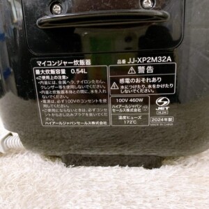 本機はコンパクト3合クラスのマイコン式で、日常使いに十分なメニュー搭載・2024年製という年式の新しさが評価ポイントです。一方で、IH上位機と比べると加熱方式はシンプルで、上限相場は伸びにくいカテゴリー。また外装に小キズ、付属品の一部が未確認という減点要素を考慮しました。これらを総合し、需要の安定した3合帯の相場と当社再販経路を踏まえて2,500円をご提示。