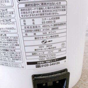 お預かりしたEE-DB50は、加熱式(スチーム式)加湿器で、定格加湿能力480mL/h・連続運転時消費電力410Wのモデルです。外観はホワイトカラーで、上部の吹出口まわりや水タンク内部に若干の水垢と使用に伴うくすみがありましたが、割れや変形はなく動作も安定。通電確認では蒸気の立ち上がりも良好で、内部センサーや安全装置の作動も正常でした。フィルター交換時期ランプも未点灯で、全体としては一般使用品として良好な状態です。