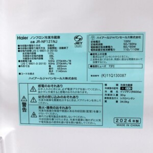 Haier(ハイアール)のJR-NF121NJは2024年発売の最新モデルで、省エネ性能の高さと静音設計が特徴。市場でも人気が高く、状態も非常に良好であったため、今回は2,100円の査定金額をご提示いたしました。