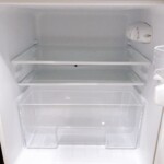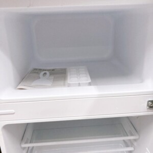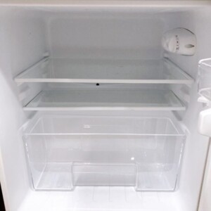 外観はブラックカラーのスタイリッシュなデザインで、目立つキズや汚れもなく全体的にきれいな状態でした。庫内のガラス棚や野菜ケースにも割れ・欠けはなく、冷却動作も良好。説明書と製氷トレーも付属しており、再販に適した状態でした。