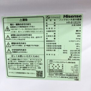 今回は川崎市にお住まいの女性のお客様より、Hisense(ハイセンス)ノンフロン冷凍冷蔵庫 HR-B12E2W(2023年製)を出張買取にてご依頼いただきました。