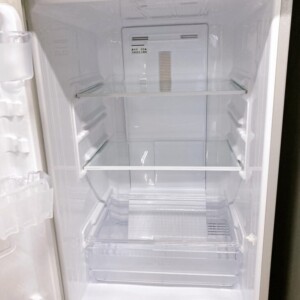 本機は定格内容積167L(冷蔵121L/冷凍46L)、幅480×奥行590×高さ1285mmの2ドア下段冷凍タイプ。庫内はガラス棚・クリアトレー・野菜ケースが揃い、割れや欠けなし。臭い残りも少なく、パッキンの密着も良好でした。外装は正面と側面に搬入・使用に伴う細かなすれ傷が点在しますが、大きな凹みは見られません。動作は安定しており、ファン音や異音の指摘もありませんでした。年式が新しめで、日常使用に支障のないコンディションです。