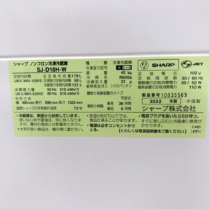 今回は大阪府柏原市にお住まいの30代主婦のお客様より、シャープ(SHARP)製ノンフロン冷凍冷蔵庫SJ-D18H-W(2022年製)を出張買取にてご依頼いただきました。