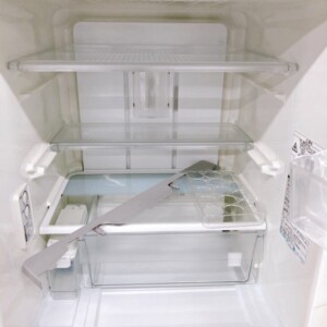 実機を拝見すると、庫内はトレイ・ケース・製氷皿まで揃っており清潔感のある状態でした。動作確認でも冷却は安定、異音や臭いも見られません。外装は正面パネルと取っ手まわりに使用に伴う細かな擦れがわずかにあるものの、全体としては丁寧にお使いの印象。容量は全体340L(冷蔵252L/冷凍88L)、本体サイズは幅600×奥行679×高さ1608mmで、都内のマンションにも収まりやすい標準的な3ドアモデルです。