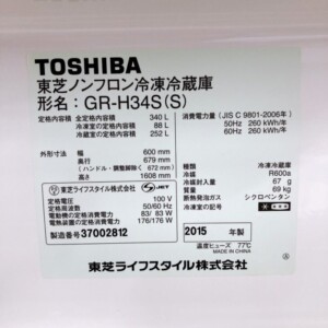東京都中野区で東芝 冷蔵庫 GR-H34S(S) を出張買取 2015年製・外装にごく小傷ありのため適正価格で査定しました