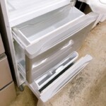 実機を拝見すると、庫内はトレイ・ケース・製氷皿まで揃っており清潔感のある状態でした。動作確認でも冷却は安定、異音や臭いも見られません。外装は正面パネルと取っ手まわりに使用に伴う細かな擦れがわずかにあるものの、全体としては丁寧にお使いの印象。容量は全体340L(冷蔵252L/冷凍88L)、本体サイズは幅600×奥行679×高さ1608mmで、都内のマンションにも収まりやすい標準的な3ドアモデルです。